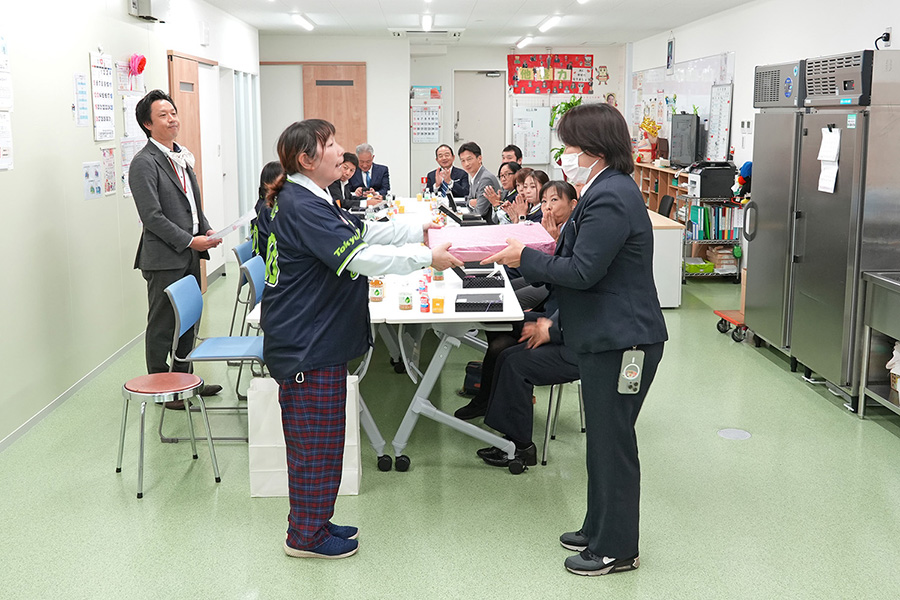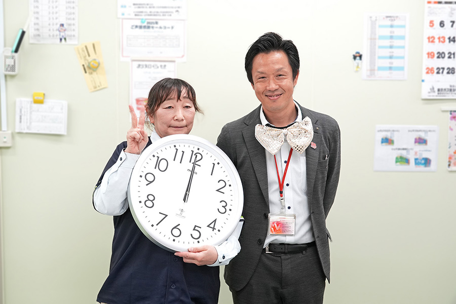 当日はオープン記念のテープカットからはじまり、社長ほか来賓の方からのご挨拶をいただき、参加者一同で会食を楽しんだ後に、各ヤクルトレディさんから抱負を伺い、最後に記念品としてセンター内に掛ける大きな掛け時計の進呈が行われました。