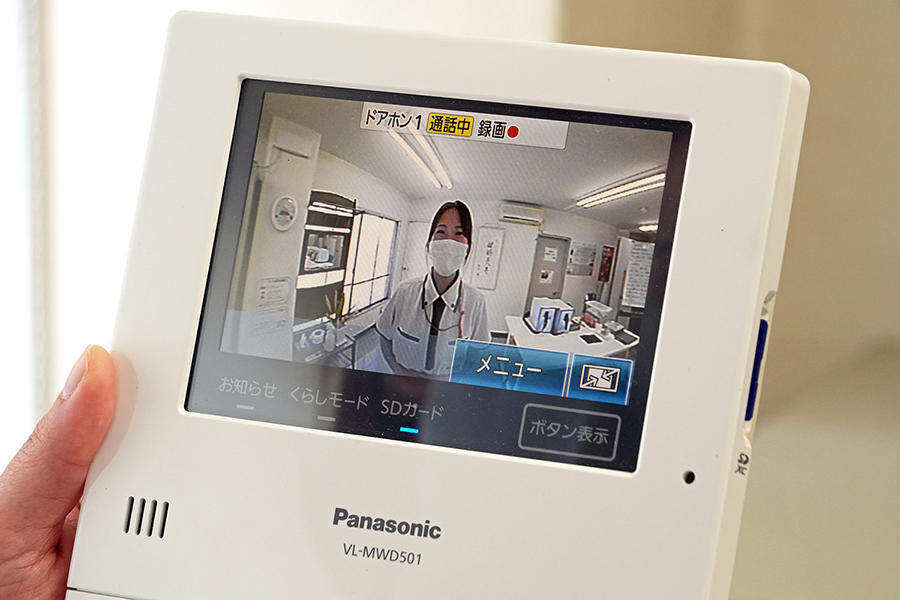 実際のインターホンを使用して行うこの研修では、初めて訪問するお宅を想定してヤクルトレディとお客さまの設定に分かれ、交代でインターホンに向かって地域の皆さまにごあいさつするトークの練習になります。