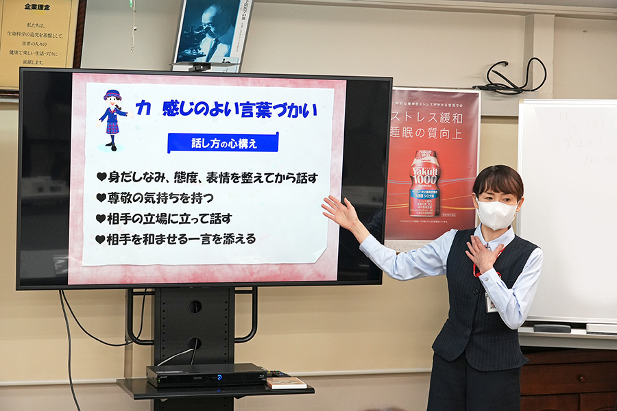 今回はヤクルトレディのお仕事をスタートするにあたり、お客さまとのコミュニケーションを大切にするための「マナー研修」の様子をお伝えします。