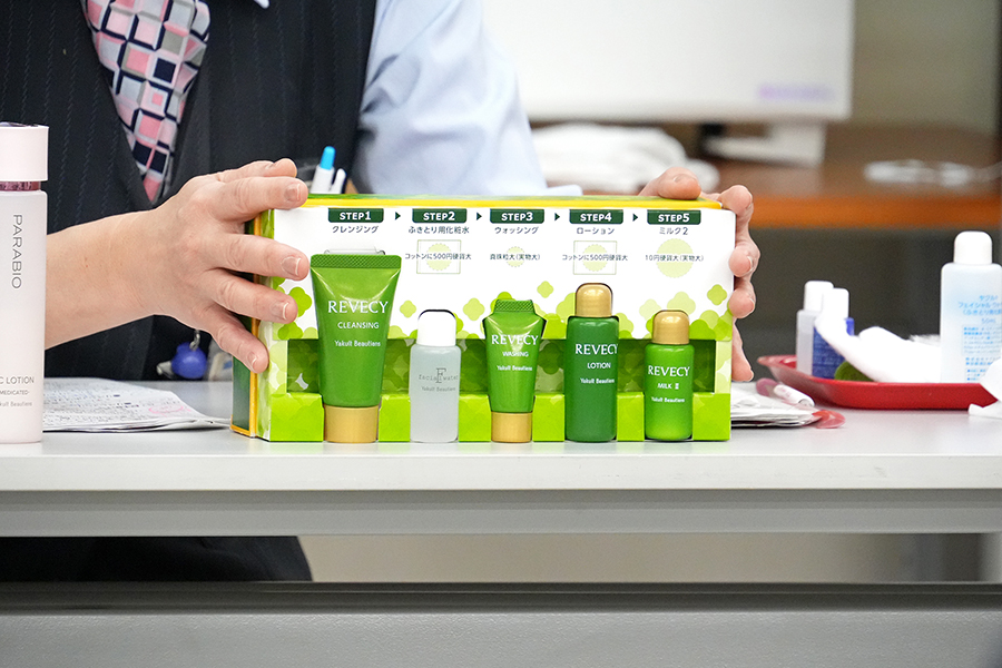 化粧品研修はヤクルト化粧品の良さをお客さまにきちんとお伝えできるように、ヤクルト化粧品の歴史やブランド別の商品特長を学んでいただくだけではなく、「正しいお手入れの仕方」や「正しい量と正しい使い方」を実際に化粧品を使って体感していただく研修になります。ご自宅でもじっくり体感していただけるように一週間のお試しセットもプレゼントさせていただいています!!